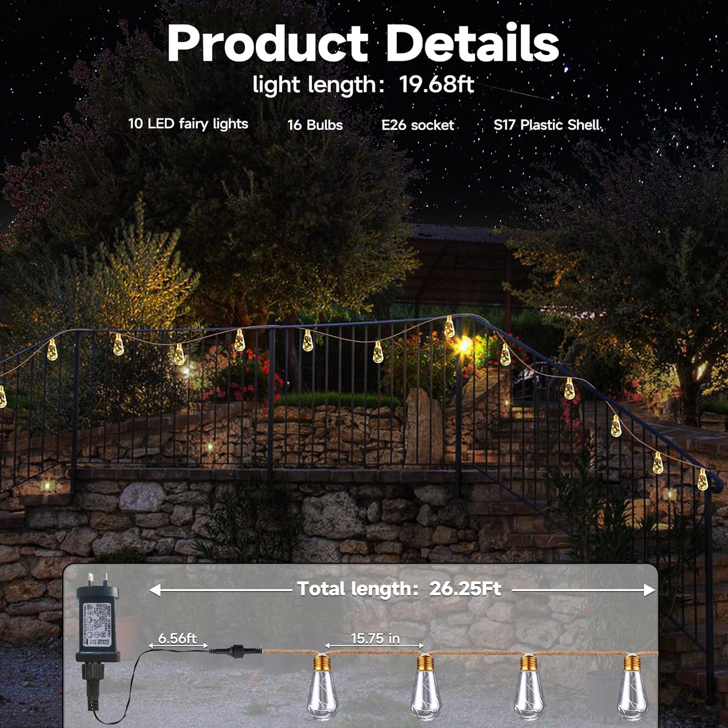 - Super Bright Plug in Outdoor Lights: 26.56Ft hanging string lights with 16 warm white LED bulbs, brighter than traditional LED string lights, making your lighting display bright and have a charming decorations of your home, party, wedding, festivals. Light length 20ft, lead length 6.56ft, Each bulb includes 10 LEDs, a total of 160 LEDs.