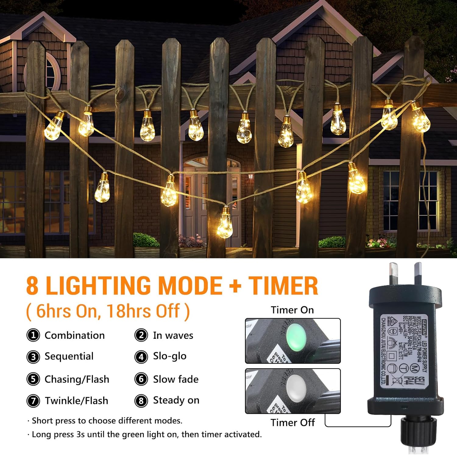 - 8 Lighting Modes & Timer Setting: The shatterproof fairy lights for outside have a mode button, short press the mode button to select 8 different modes to satisfy your diverse needs. Long press 3 seconds until the green light is on, then timer is activated and remains on for 6 hours and off for 18 hours.